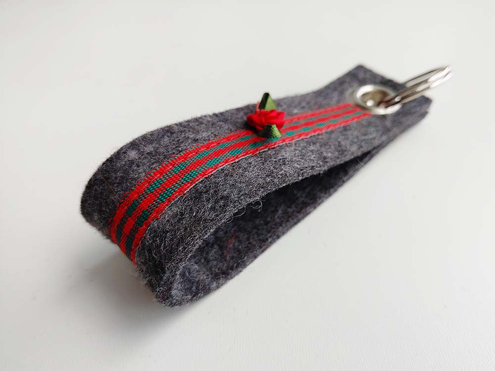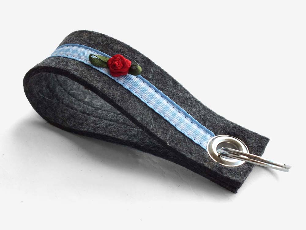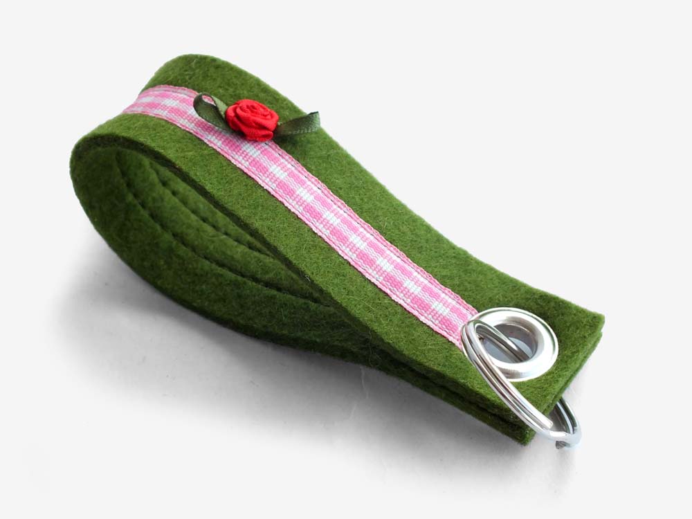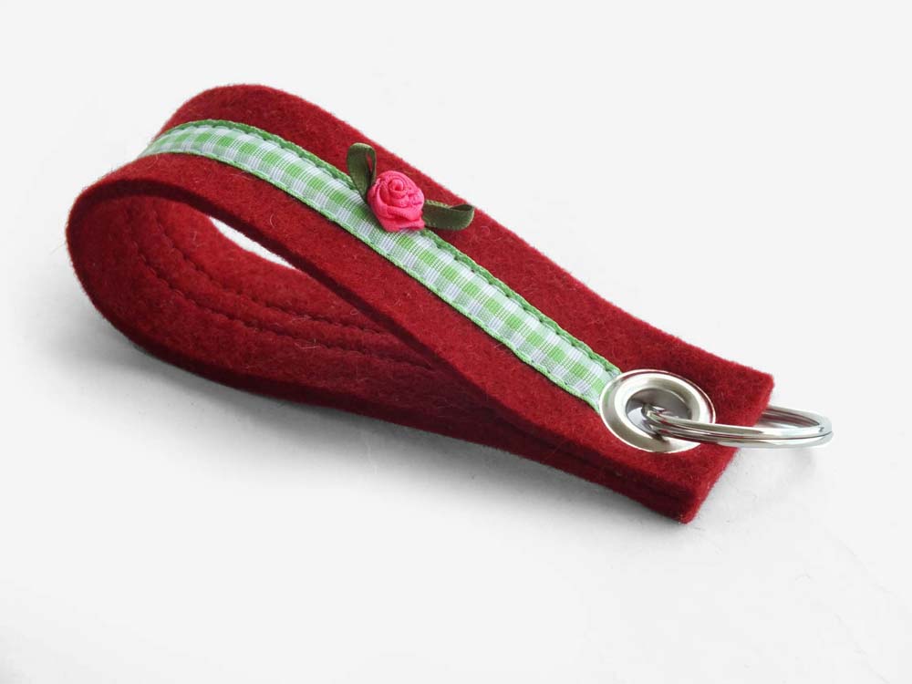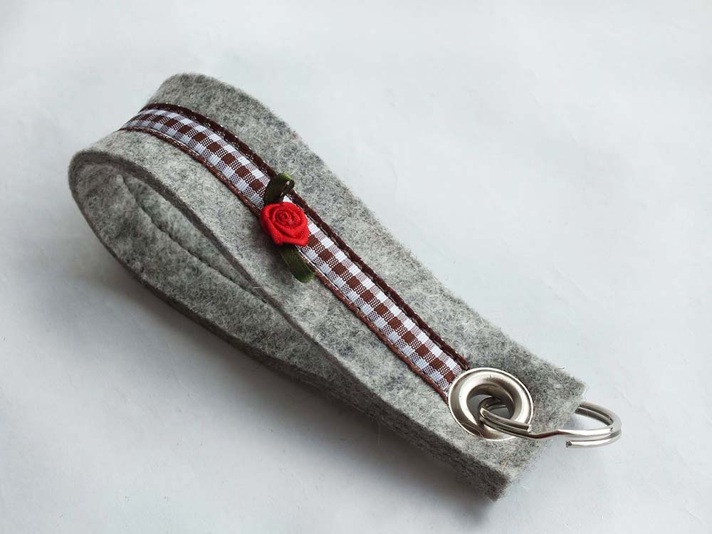 Lustiger Filz-Schlüsselanhänger (Schlaufe) mit Karoborte und kleiner Satinrose.