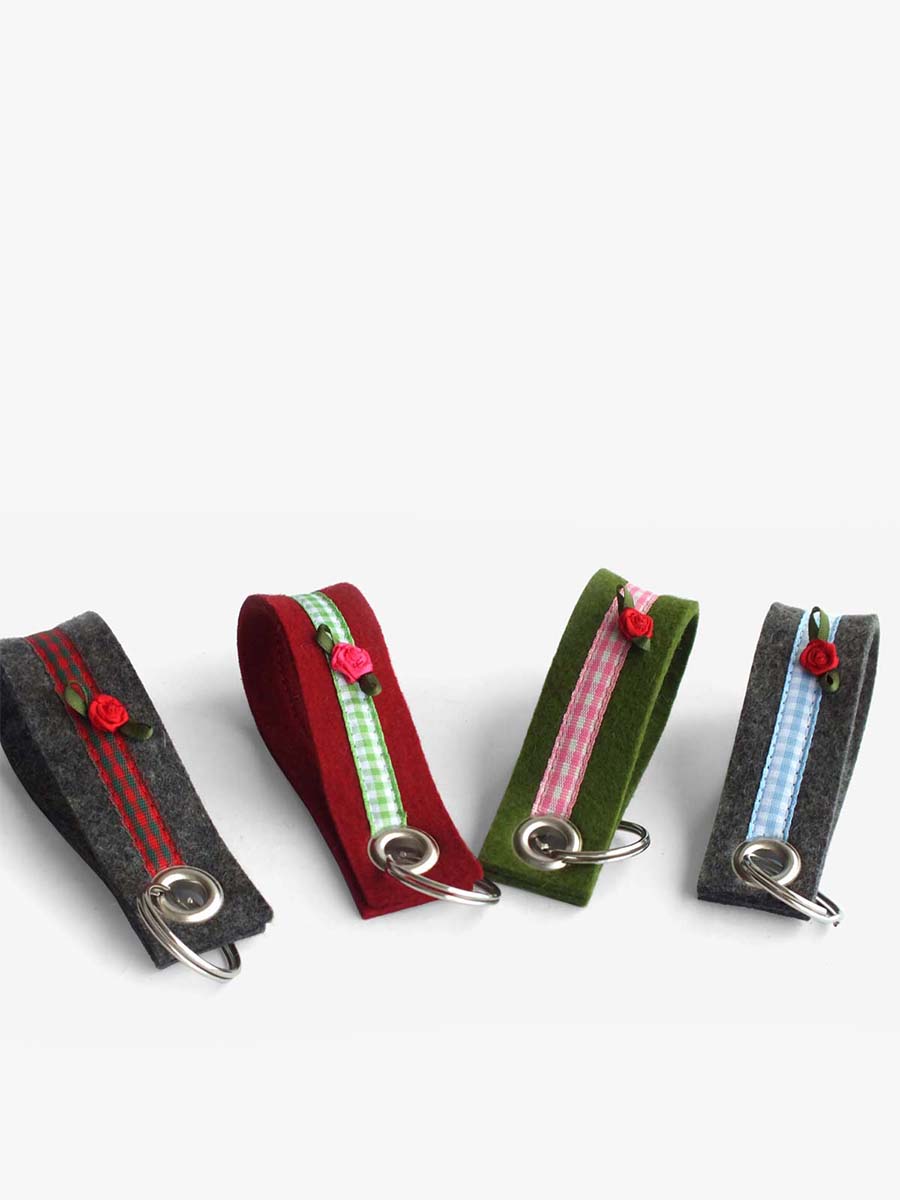 Key bands made of wool felt with vichy check ribbon and satin rose