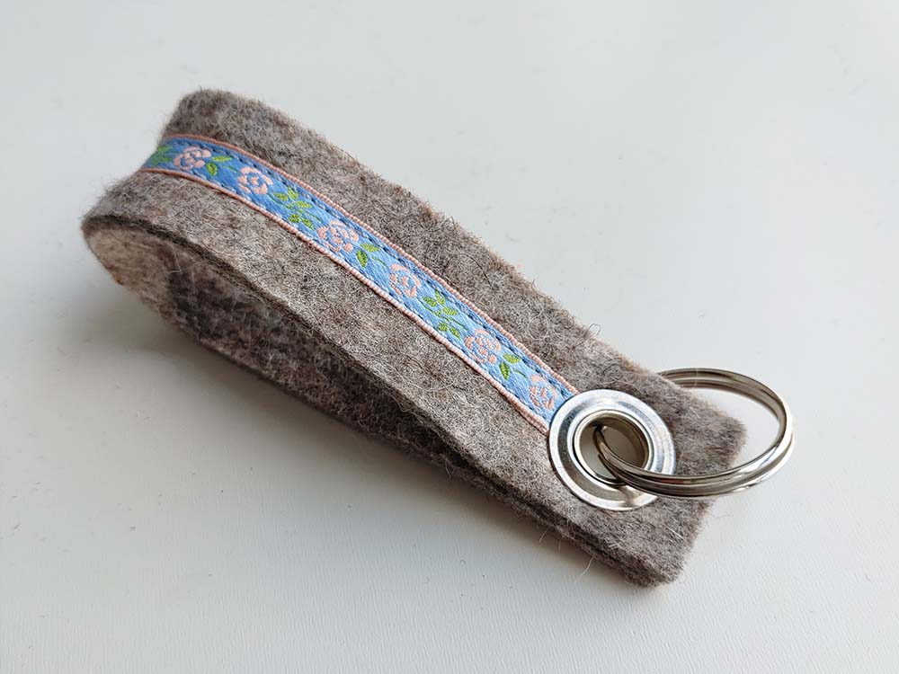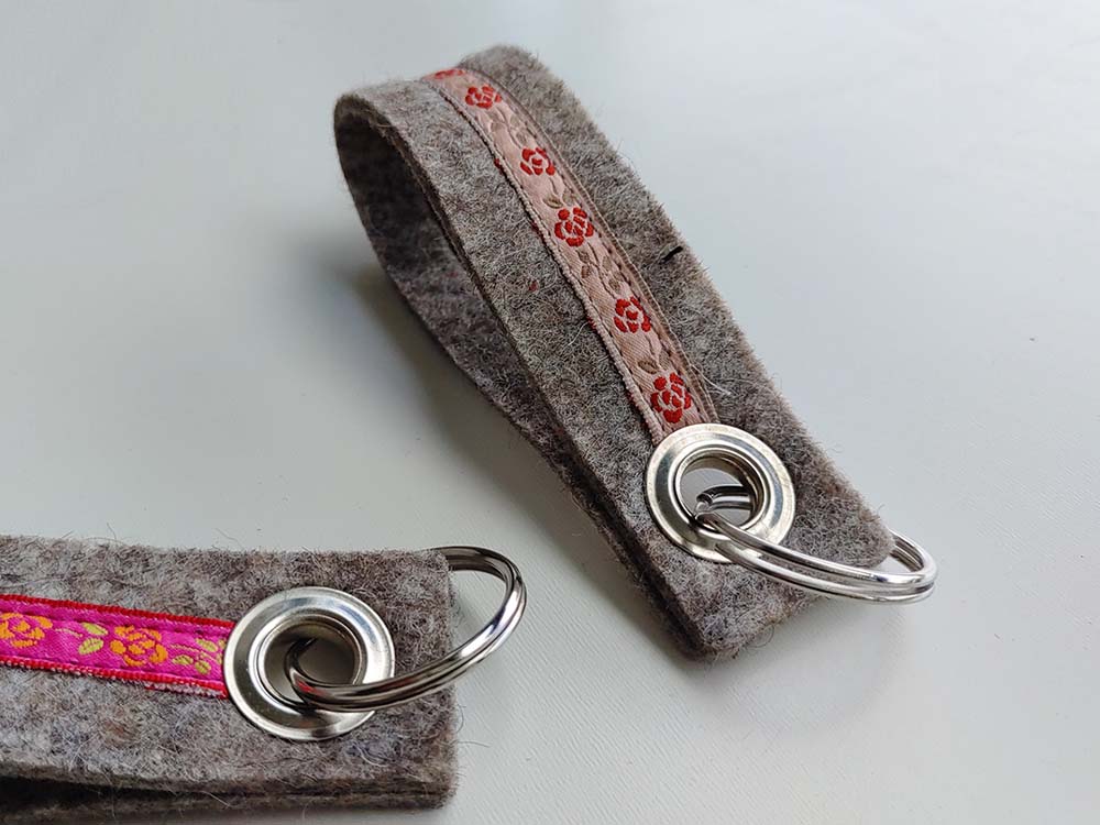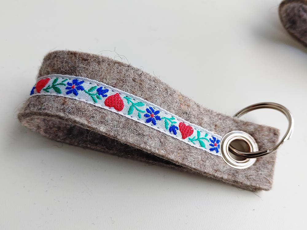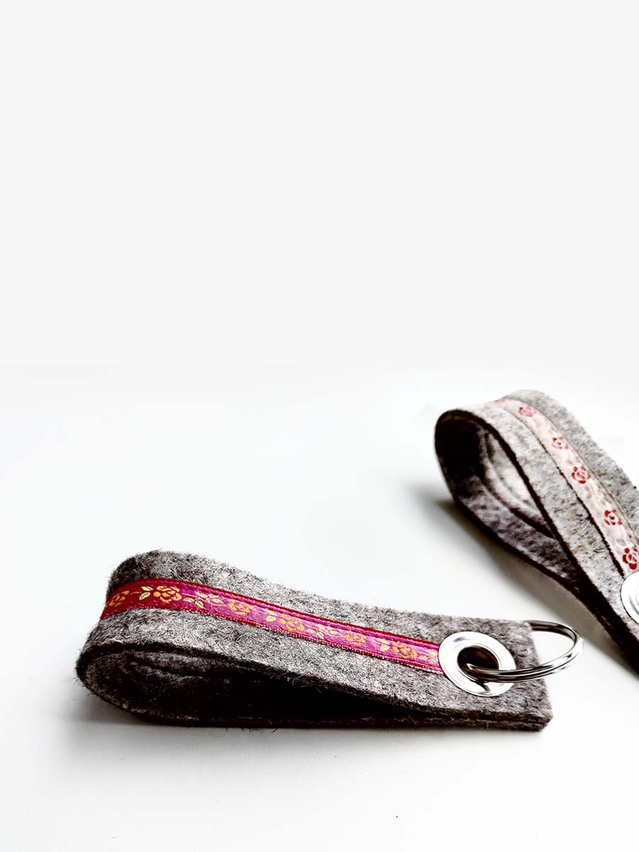 Filz-Schlüsselanhänger (Schlaufe) mit Rosenborte. Der Filz ist immer hellgrau, die Rosenborte gibt´s in drei Farben, siehe Auswahl.